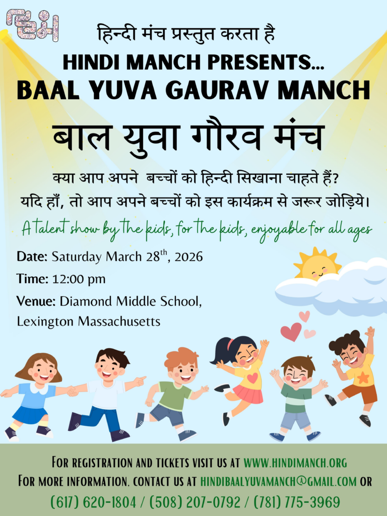 Baal Yuva Vibhag is a group within Hindi Manch that focuses on passing our great language “Hindi” to the next generation but in a fun filled way. For many of us living far away from home, this is probably closest to our hearts. We, as parents, know that these are not the times when things can be imposed on kids, but you make it fun and they will be enticed and that’s the primary objective of this group!