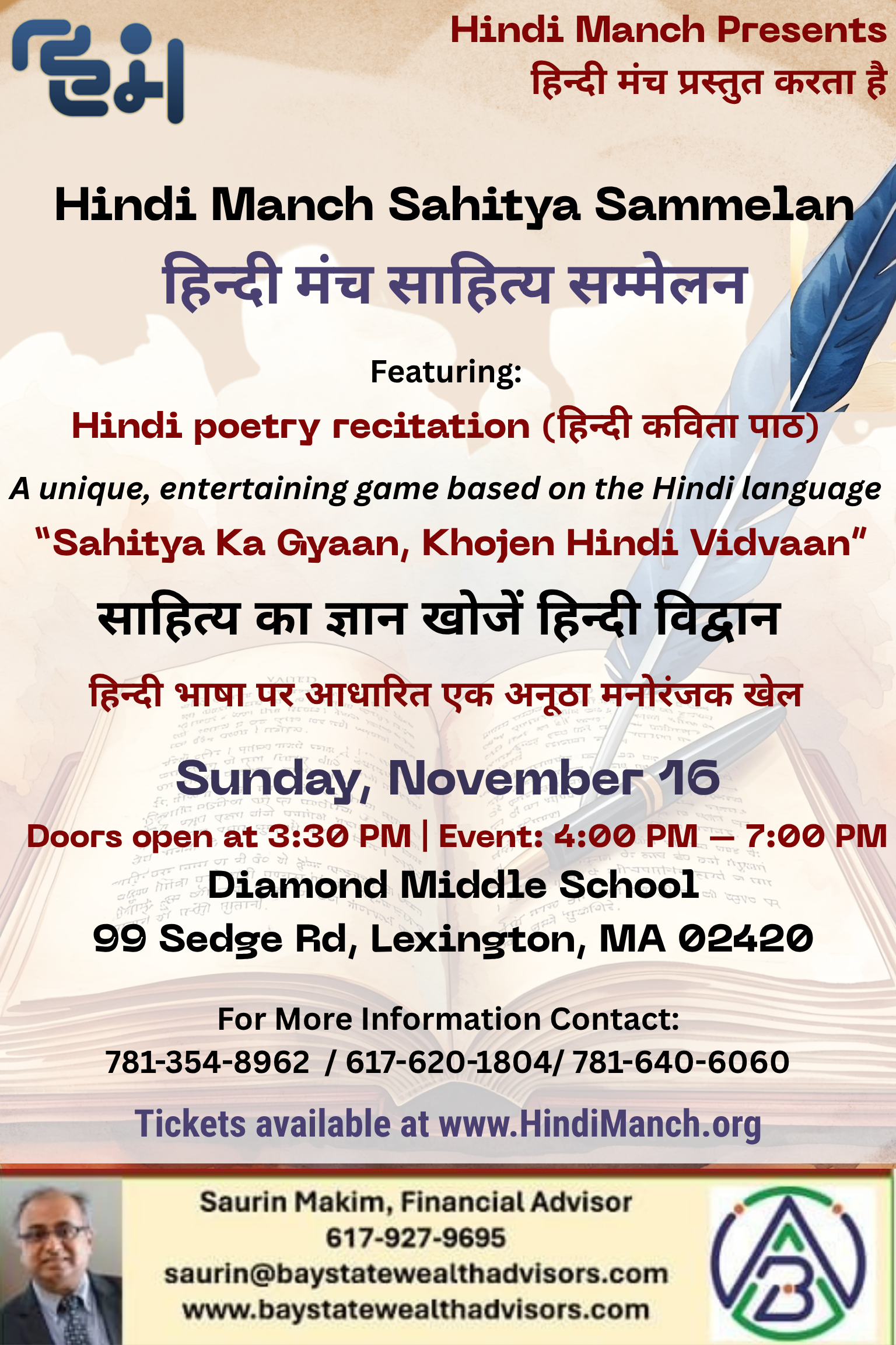 “Sahitya Vibhag” has been the main link between the Hindi-Urdu literature loving community in New England area and the pearls of Hindi Urdu Literature. As one of the main departments of Hindi Manch, Sahitya Vibhag purely focuses on to bring Literary activities of Hindi, Urdu and related dialects to the community such as Sahitya Sammelans, Mushairas, Sahityik Goshthis etc.